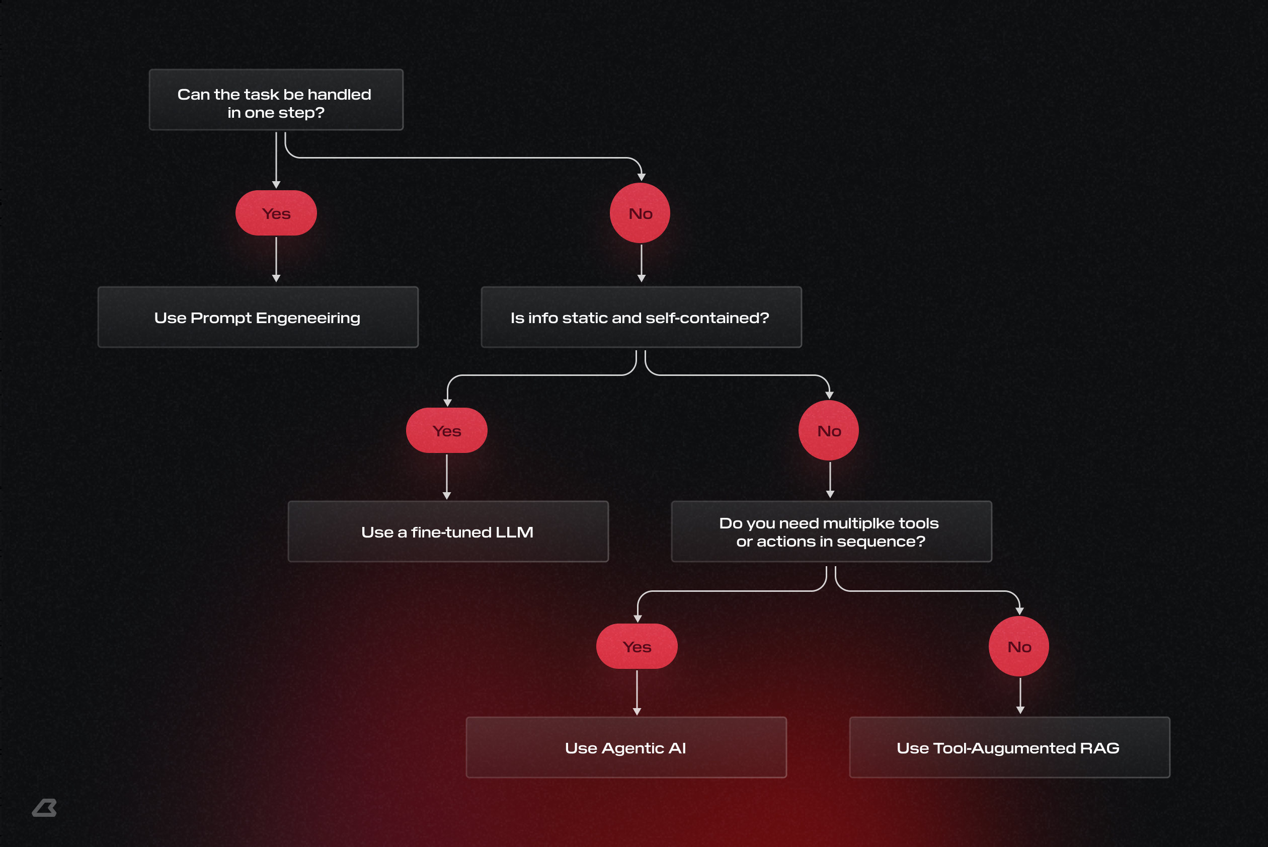 This logic tree can help teams evaluate based on real architectural trade-offs: control, cost, tool orchestration, and performance constraints. In practice, agentic AI becomes essential when single-shot or retrieval-only methods hit a wall.