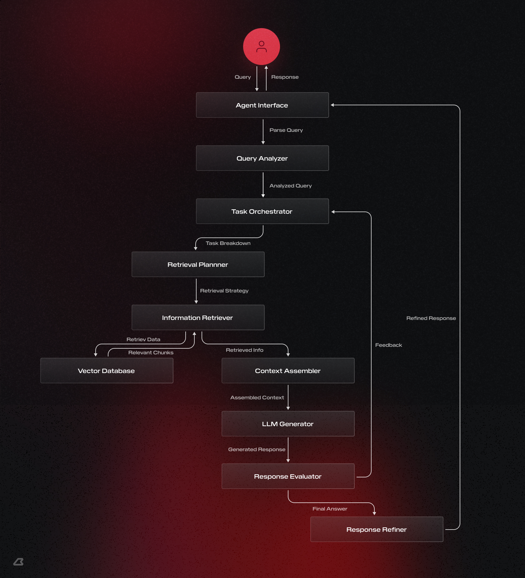 This architecture outlines how components like planners, retrievers, evaluators, and memory layers interact in a real-world agentic RAG system, turning a user query into a multi-stage reasoning and response flow.